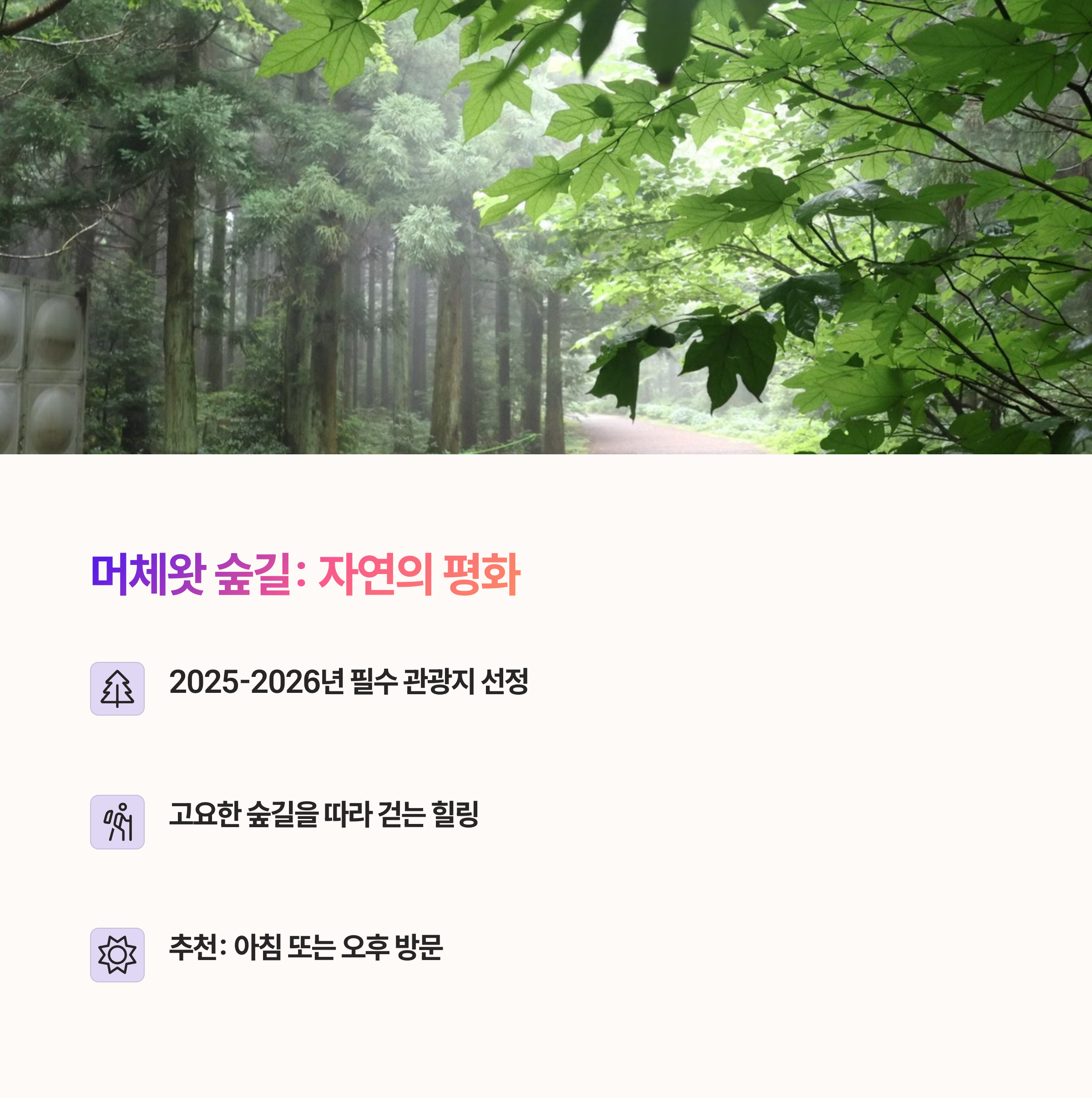 | 감성 숲길 명소 | 머체왓 숲길은 조용하고 감성적인 자연 힐링 코스로 주목받는 중 |
