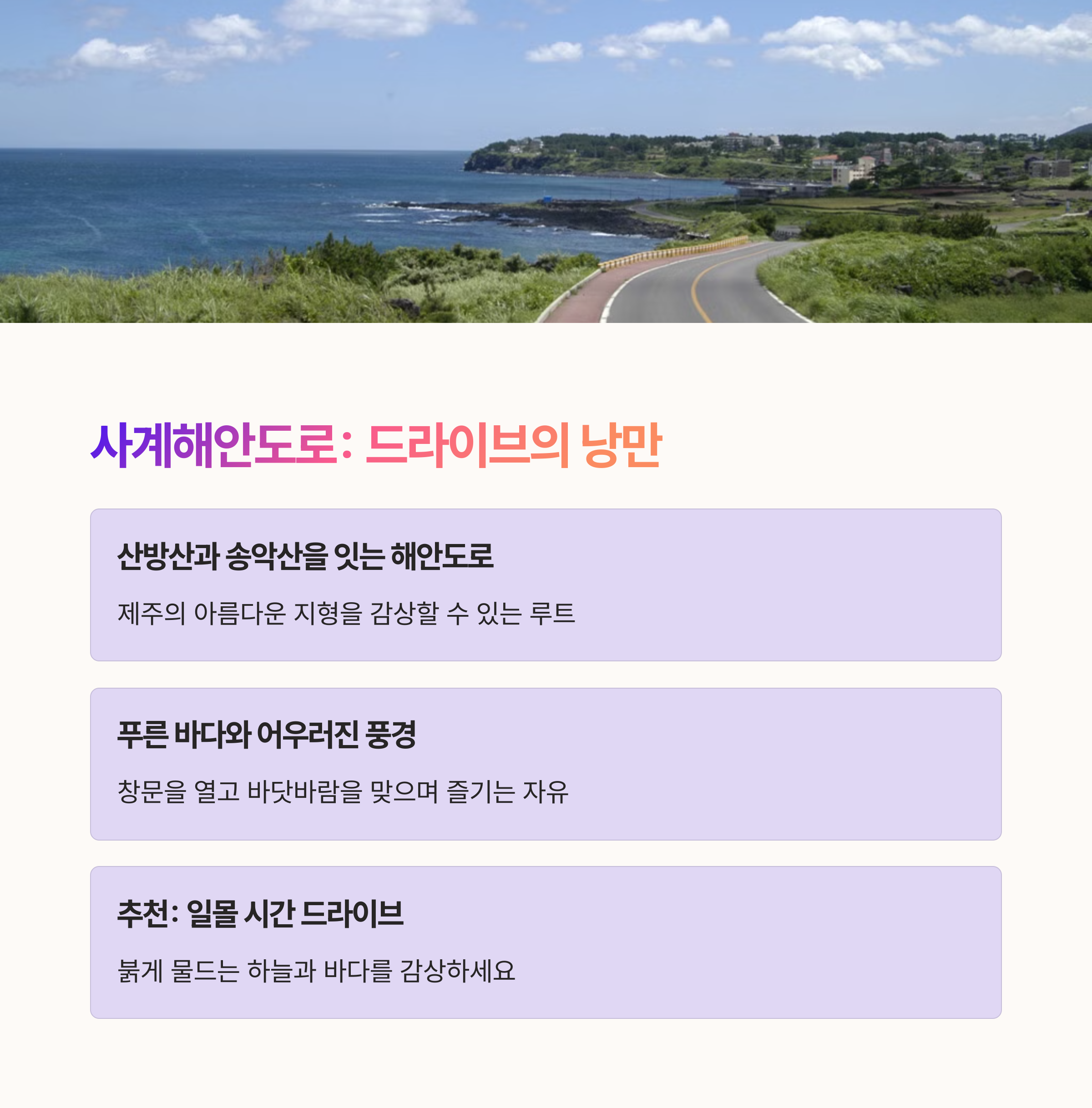 협재해수욕장과 사계해안도로는 언제나 인기지만, 최근 일몰 명소로 다시금 조명받고 있습니다. 해가 수평선 너머로 떨어지는 순간, 하늘이 붉게 물드는 그 풍경은 자연이 주는 가장 감성적인 선물입니다. 사계해안도로를 따라 드라이브하며 카페에 들러 노을을 바라보는 코스는 SNS에서 높은 조회수와 공감을 얻고 있어요. 사진 한 장으로 여행 감성을 전하고 싶다면, 이 루트를 꼭 추천드립니다.
