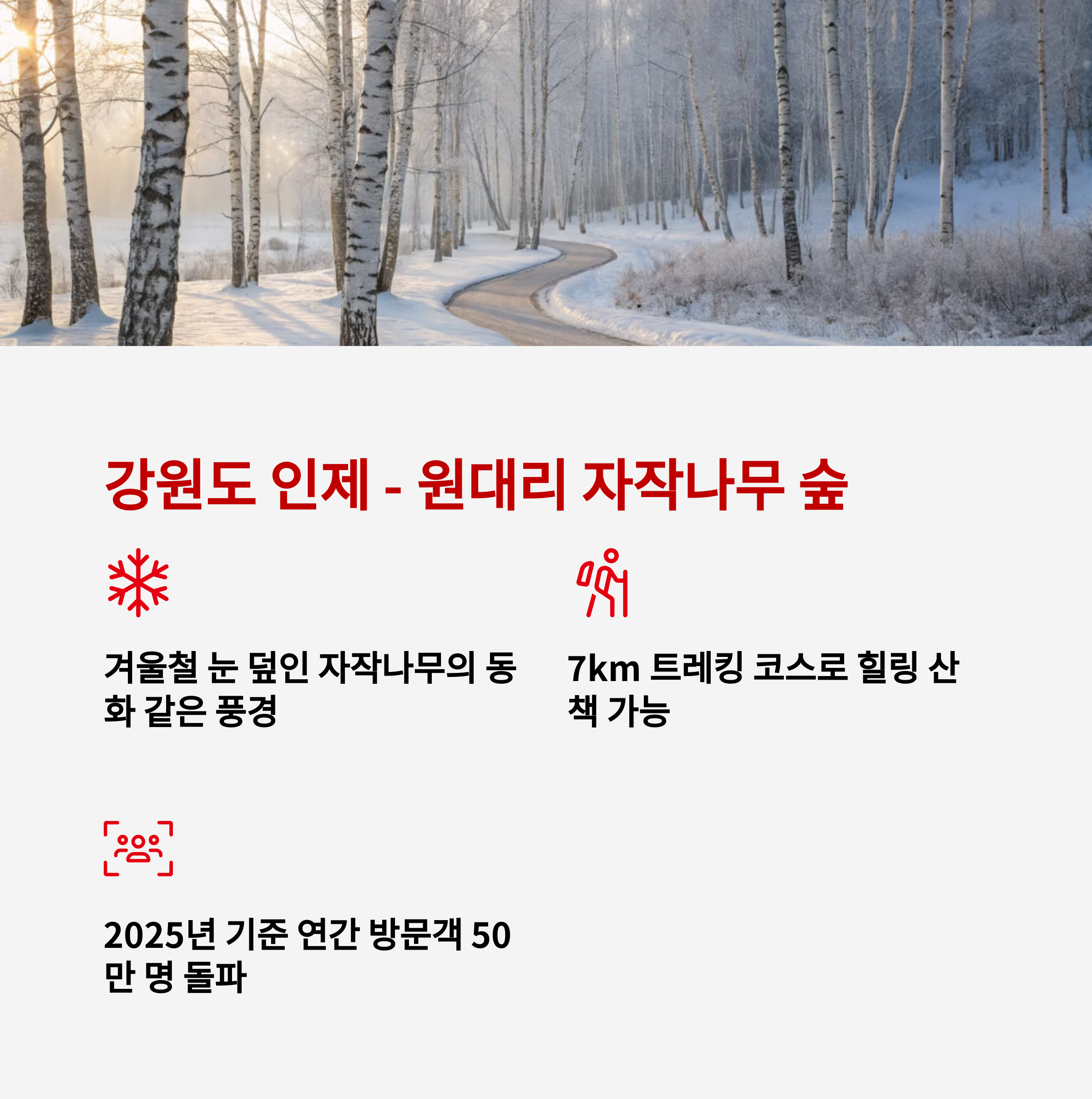 강원도 인제 원대리 자작나무 숲은 마치 동화 속 세상 같은 분위기를 자아내는 명소입니다. 겨울철에는 눈 덮인 자작나무 숲이 신비로운 풍경을 연출하며, 가벼운 트레킹 코스로도 추천됩니다.